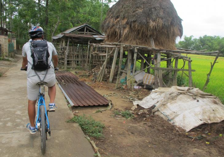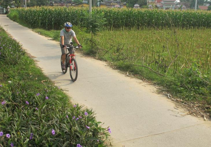 From here the scenery opens up and the countryside becomes more rustic. The road remains flat throughout this section of the ride as we pass by duck farms, past old pagodas and enjoy views of farmers out in the field and fisherman in the river casting nets.