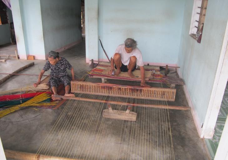 Once on the island we start biking through small villages and rice paddies on a narrow roads and dirt trails. Boat making can be seen right from the trail as many of the local fishing vessels are made here.We ride on this island for about an hour before crossing a long wooden bridge over to Ban Thach – Dong Binh rush making village.